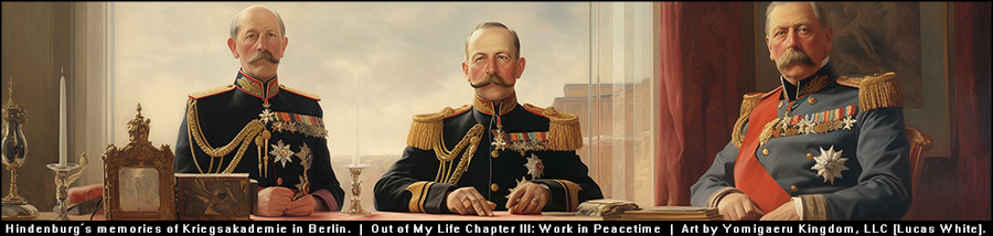 Fate was kind to me in that I found a very great variety of employment within the General Staff. Even while I was attached to the Great General Staff I was assigned the duty of teaching tactics at the Kriegsakademie. I derived great pleasure from this work, and continued it for five years. It is true that the demands on me were very great, as in addition to this I had to do other work simultaneously, both in the Great General Staff and subsequently as the first General Staff Officer with the Headquarters Staff of the 3rd Army Corps. In these circumstances the day of twenty-four hours often seemed too short. It was quite usual for me to work the whole night through.